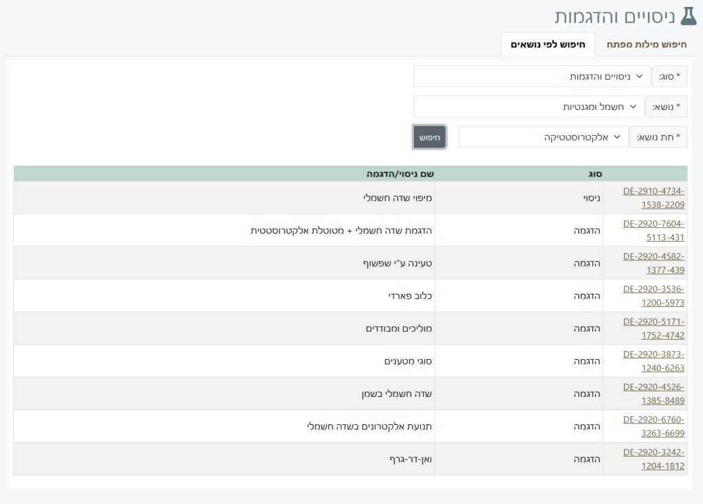 בחרו את הנושא ותת-הנושא וקבלו את רשימת הניסויים וההדגמות המשוייכות להם.