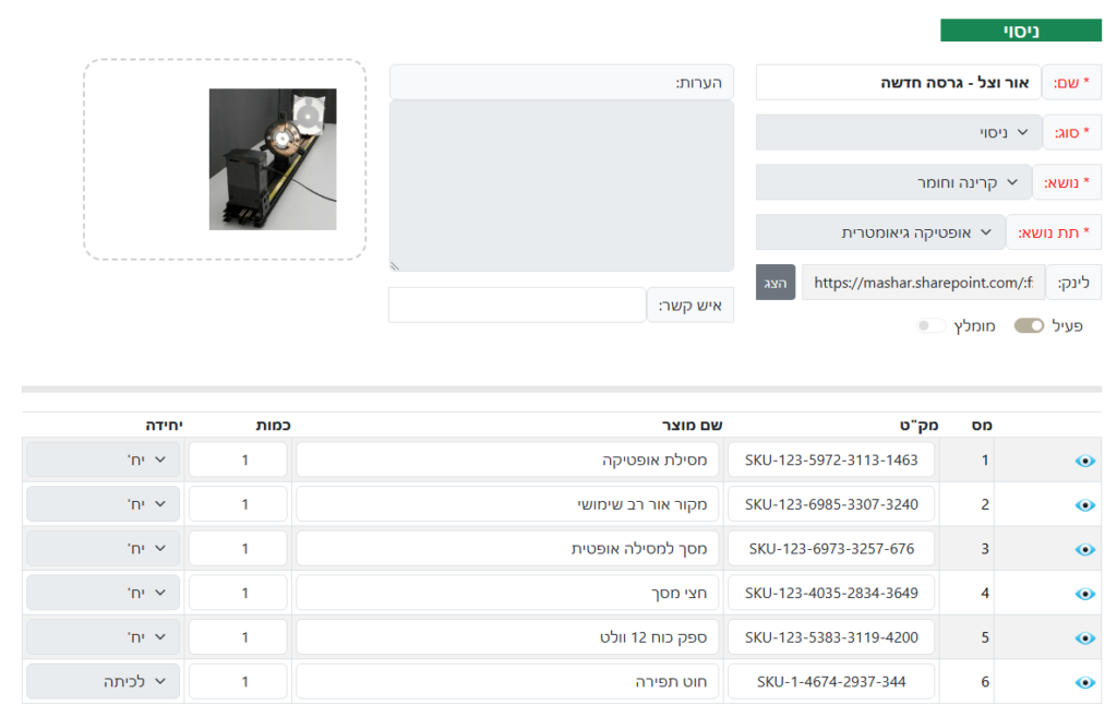 אחרי שתבחרו ניסוי/הדגמה, יפתח מסך הפרטים הבא: