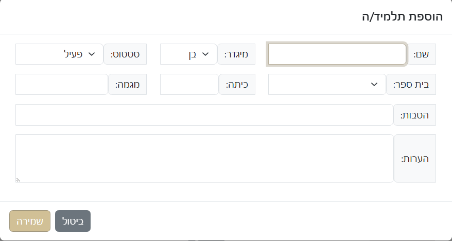 לחצו על כפתור "הוספת תלמיד" ומלאו את הטופס שיפתח.